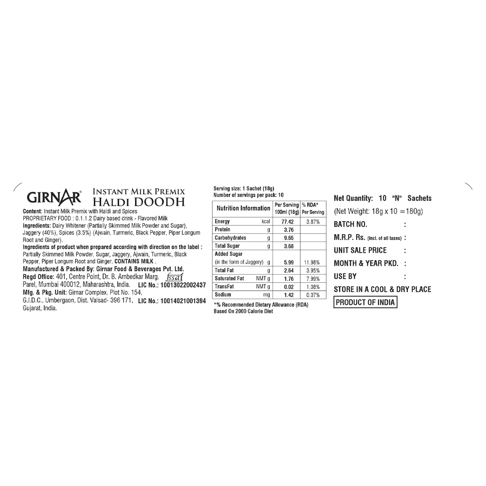 Girnar - Premixed - Haldi Doodh - 180G - Box of 10